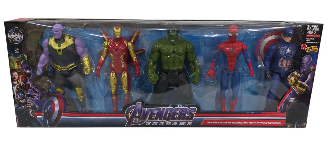 • 5 фигурок: Железный Человек, Халк, Капитан Америка, Человек-Паук, Танос (по 15 см)