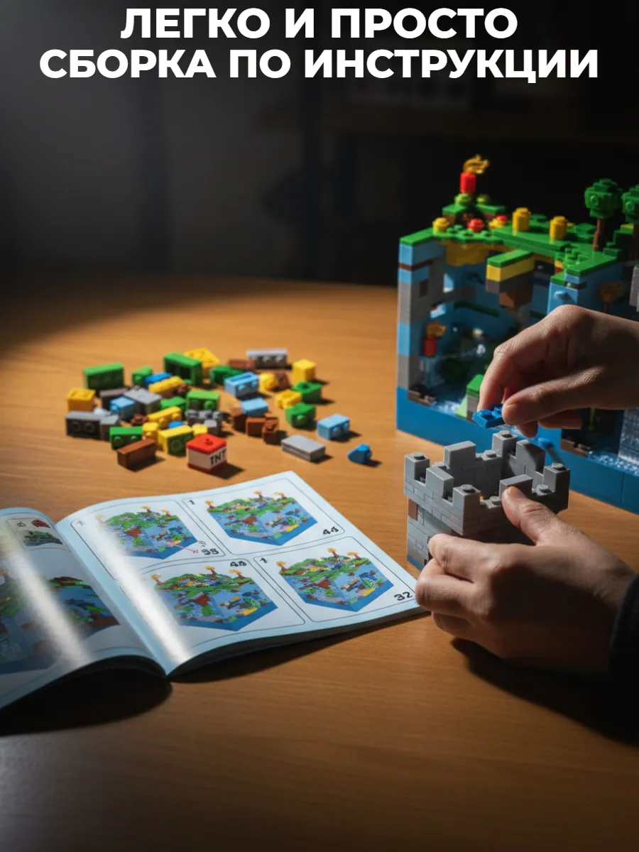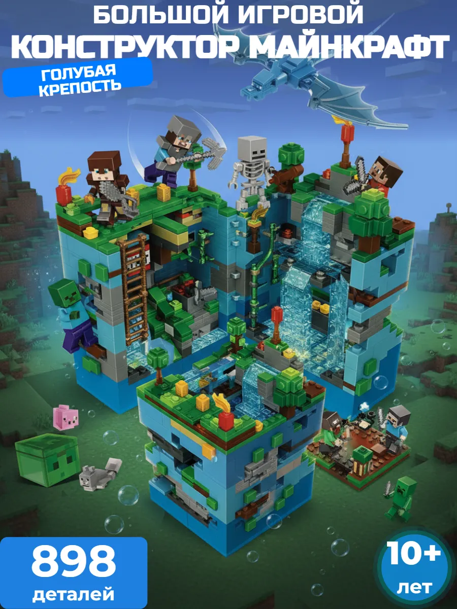 Погрузитесь в захватывающий мир Minecraft с этим впечатляющим конструктором «Голубая крепость». Набор из 898 деталей позволит создать масштабную многоуровневую крепость с водопадами, пещерами и световыми эффектами.
